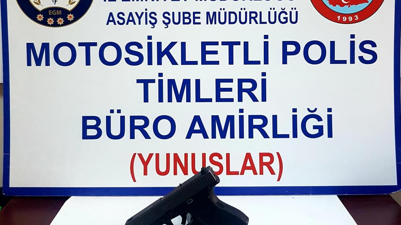 Araçta yapılan aramada, 1 adet ruhsatsız tabanca ve bu tabancaya ait 21 adet fişek ele geçirildi.