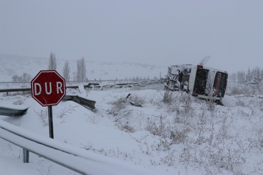 Kütahya-Eskişehir kara yolunda seyir halindeki otobüs, Kümbet kavşağı yakınlarında bariyerlere çarparak devrildi.