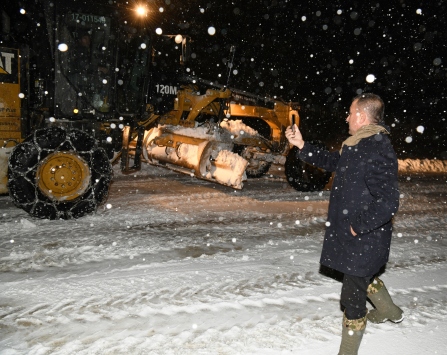 İl Özel İdaresine bağlı ekipler, köy yollarında iki greyder ve iki kepçeyle kar ile mücadele çalışmalarını gece de sürdürdü.