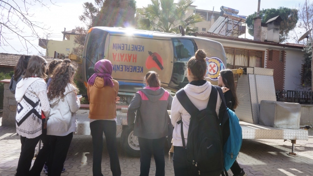 Manisa İlçe Emniyet Müdürülüğü önünde kurulan simülasyon aracında, öğrencilere emniyet kemerinin önemi anlatıldı.