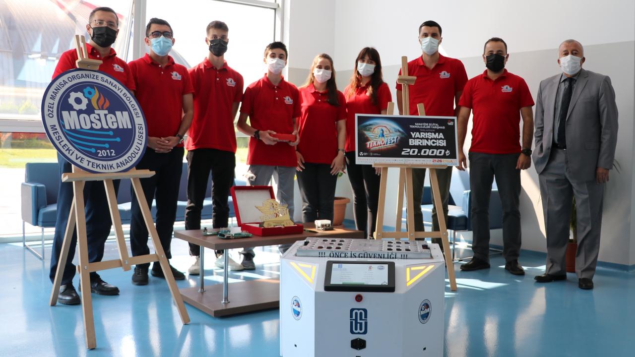 Özel Manisa Organize Sanayi Bölgesi Mesleki ve Teknik Anadolu Lisesi (MOSTEM) öğrencileri tarafından tasarlanan, bu yılki havacılık, uzay ve teknoloji festivali TEKNOFEST'te birincilik elde eden lojistik robotu "RoboMOSB", fabrikalardan görev bekliyor.