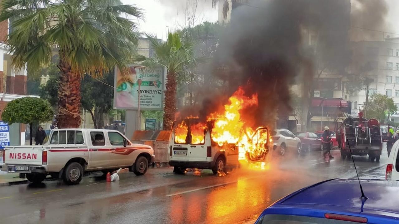 İzmir Caddesi'nde M.K yönetimindeki hafif ticari araç, 15 Temmuz Demokrasi Meydanı yakınlarında yanmaya başladı.