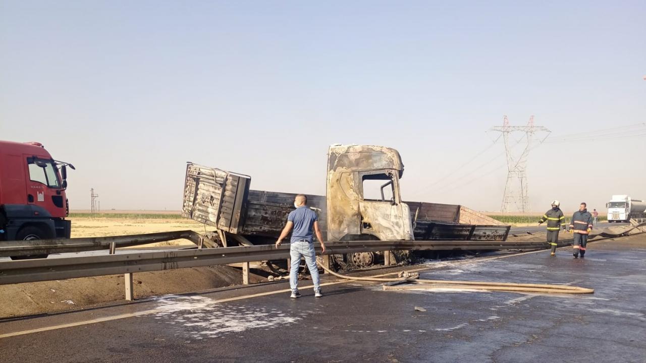 Mardin'de alınan bilgiye göre, Kızıltepe-Viranşehir kara yolunda refüje çarpan tır alev aldı.
