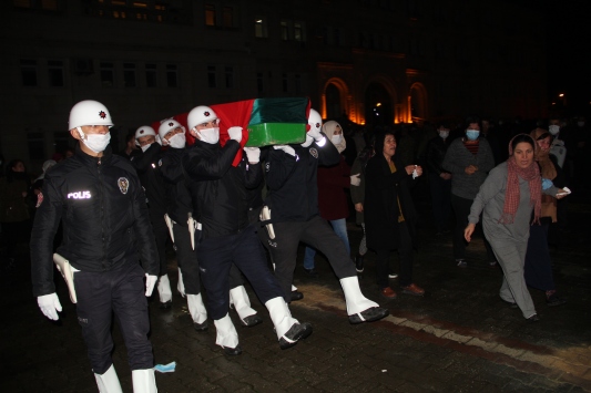 Nusaybin'in Dibek Mahallesi kırsalında karakol inşaatında çalışan sivillere dün PKK'lı teröristlerce uzun namlulu silahlarla açılan ateş sonucu şehit olan Gözenoğlu'nun Türk bayrağına sarılı naaşı Hükümet Konağı önüne getirildi.