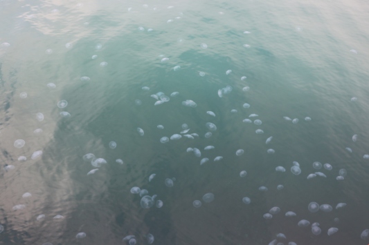 Tekirdağ Süleymanpaşa kıyı şeridinde yürüyen vatandaşlar deniz yüzeyini kaplayan denizanalarıyla karşılaştı.