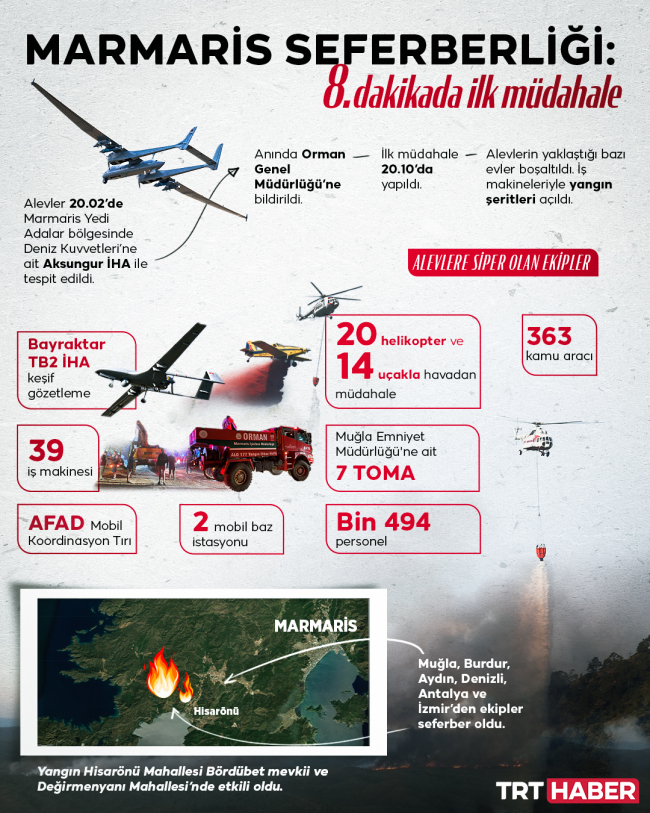 Alevler, 20.02’de Marmaris Yedi Adalar bölgesinde Deniz Kuvvetleri’ne ait İHA ile tespit edildi ve Orman Genel Müdürlüğü'ne bildirildi.