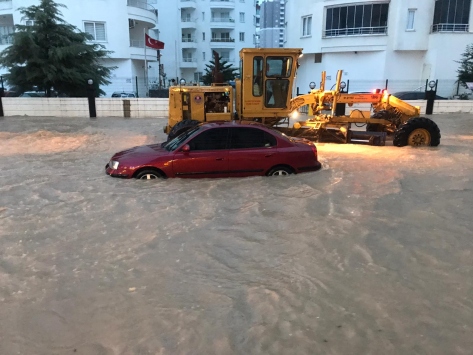 Belediye ekiplerinin, çok sayıda aracın mahsur kaldığı mahallelerdeki suların tahliyesi için başlattığı çalışmalar sürüyor.