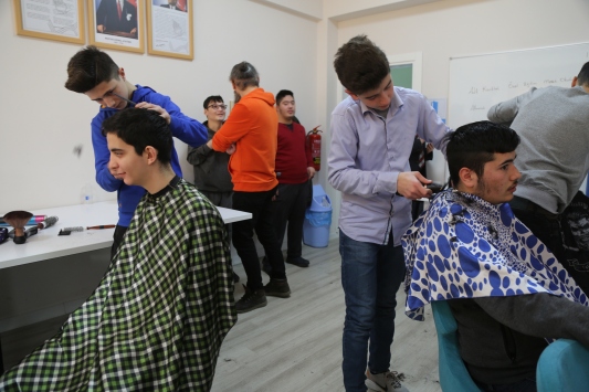 Proje kapsamında, belli periyotlarda okula gelen meslek eğitim merkezindeki kadın ve erkek kuaförlüğü bölümü öğrencileri, farklı engeli bulunan çocukların saç bakımlarını ücretsiz yapıyor.