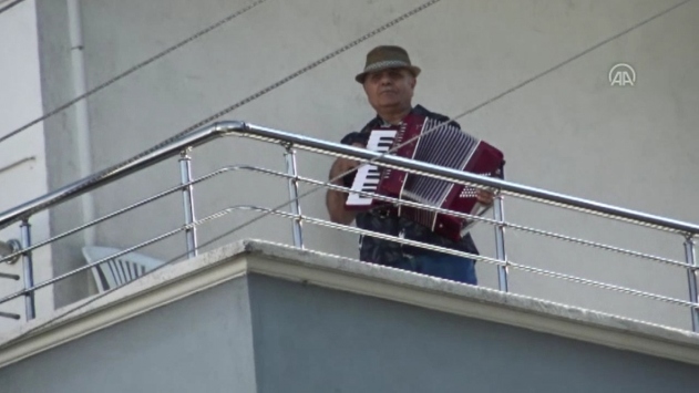 Türkiye Cumhuriyeti Devlet Demiryolları emeklisi Efe, sokağa çıkma kısıtlamasının ikinci gününde dışarı çıkamayan Plevne Mahallesi sakinlerine evinin balkonundan akordeon konseri verdi.