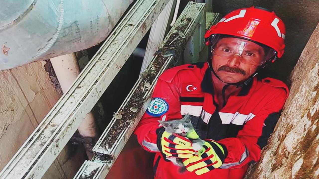 Muğla'da bina boşluğuna sıkışan kedi yavrusu kurtarıldı