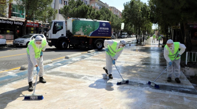 Çalışmalar sırasında cadde ve sokakların detaylı olarak yıkandı, bina girişleri ve parklar en ince ayrıntılarına kadar dezenfekte edildi.