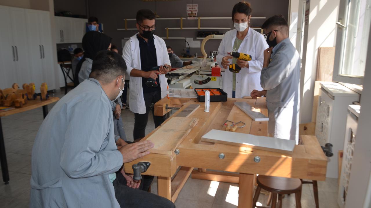 Temel derslerinin yanı sıra resim, müzik ve görsel sanatlar eğitimi alan öğrenciler, okul bünyesinde kurulan mobilya atölyesinde el becerilerini geliştiriyor.