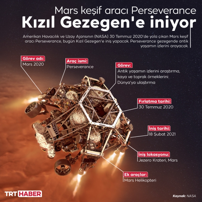 Kızıl Gezegen’in gizemlerini çözmek üzere NASA tarafından Mars’a gönderilen uzay aracı Perseverance'ın, bugün 23.55’te (TSI) Mars yüzeyine iniş yapması hedefleniyor. Tarihi anlar, 22.15'ten itibaren (TSI) TRT Haber’de canlı olarak yayınlanacak.