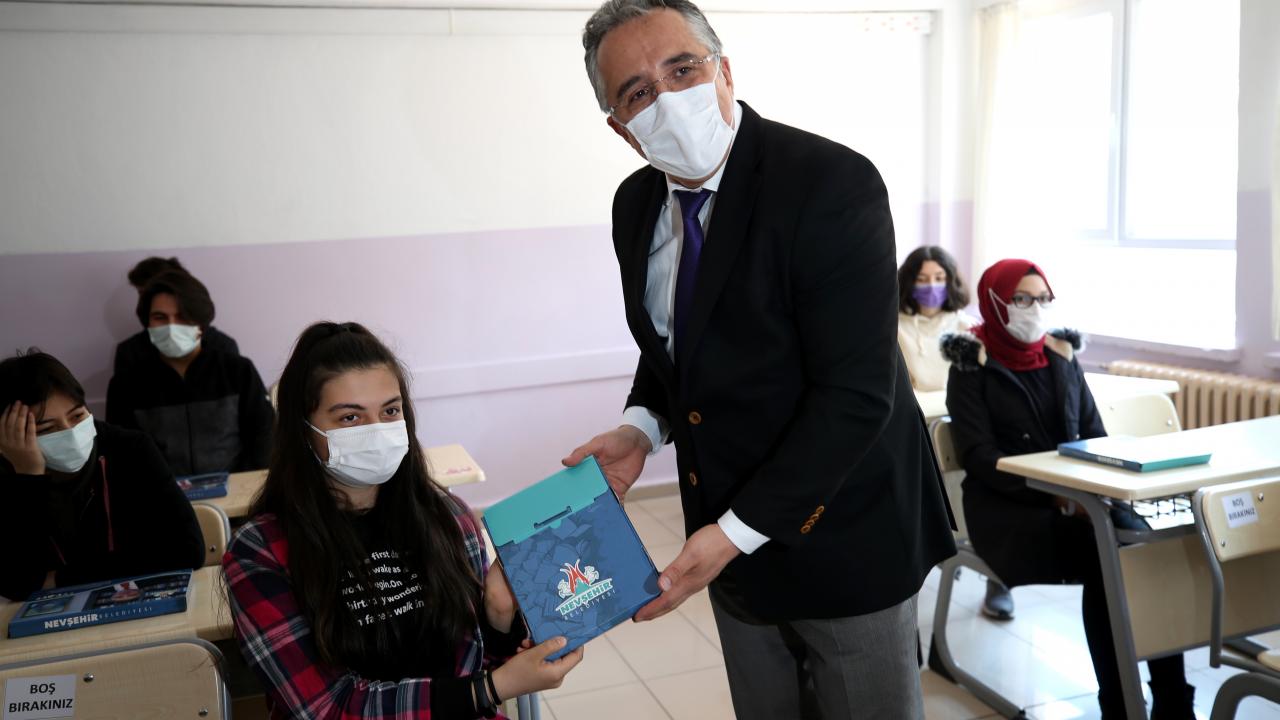 Savran, Nevşehir Anadolu Lisesinde kitap dağıtımının yapıldığı sınıflarda öğrencilere sınav kaygısını yenmeleri konusunda tavsiyelerde bulundu.