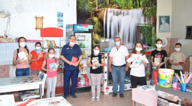 Sokağa çıkma kısıtlaması bulunan çocukları, serbestliğin uygulandığı saatlerde iş yerinde ağırlayan Aksoy, kitap alan çocuklara dondurma ikram ediyor.
