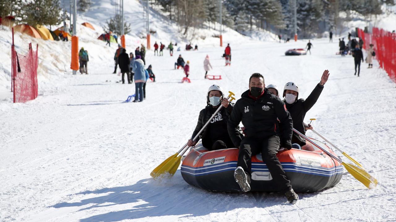 Palandöken'de bir araya gelen kulüp üyeleri, yanlarında getirdikleri rafting botlarını şişirerek kayak merkezinde kayak raftingi yaparak doyasıya eğlendi.