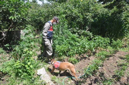 Eve, drone ve narkotik köpeklerinin de kullanıldığı operasyon düzenleyen ekipler, 182 kök Hint keneviri ile 900 gram esrar ele geçirdi, K.P'yi gözaltına aldı.