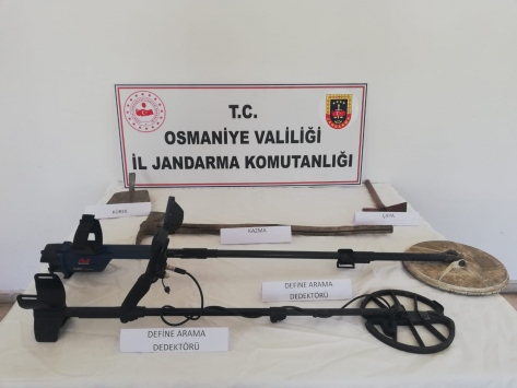 Şüphelilerin yanında bulunan 2 define arama dedektörü ile kazı malzemelerine de el konuldu.