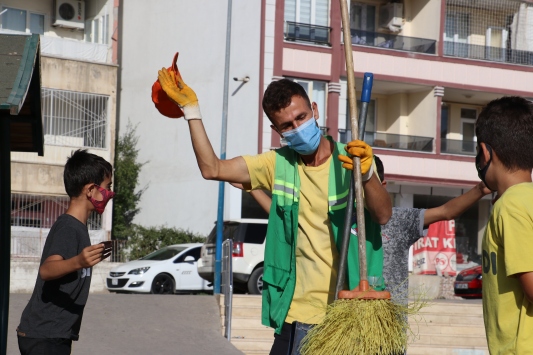 Düzenli bir işe kavuşan, evinin geçimini sağlamanın yanı sıra kardeşlerine de destek olan Atlağ, görevlendirildiği Şahinbey Çocuk Dünyası Parkı'nda çevreyi temizlerken cep telefonundan çaldığı müzik eşliğinde halay çekiyor, vatandaşlara kolonya ikram ediyor.