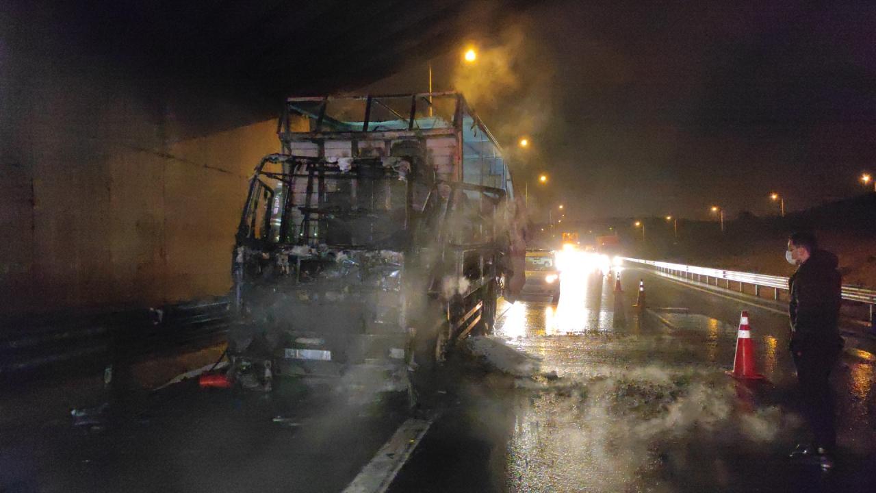 Kuzey Marmara Otoyolu Mecidiye Kavşağı mevkisinde, Kamber A. hakimiyetindeki 41 YT 132 plakalı kamyonda henüz bilinmeyen bir nedenle yangın çıktı.