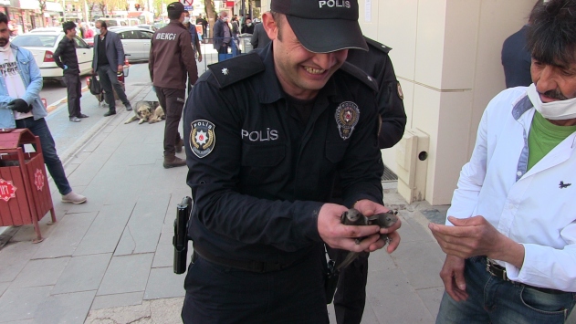 Cadde üzerindeki banka önünde sosyal mesafe kuralı kontrolü yapan polis ekipleri ile esnaf, kırlangıç yavrularını kurtarmak için panoyu söktü.