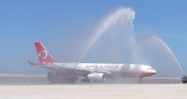 Cumhurbaşkanı Erdoğan ve Azerbaycan Cumhurbaşkanı İlham Aliyev'i taşıyan uçaklar, açılış öncesi havalimanında su takı ile karşılandı.