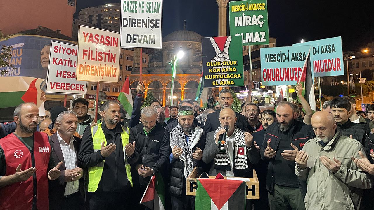 İHH İl Başkanlığı öncülüğünde Çaykur Stadı önünde düzenlenen gösteriye Rize'deki 21 dernek ve sendika üyeleri katıldı.