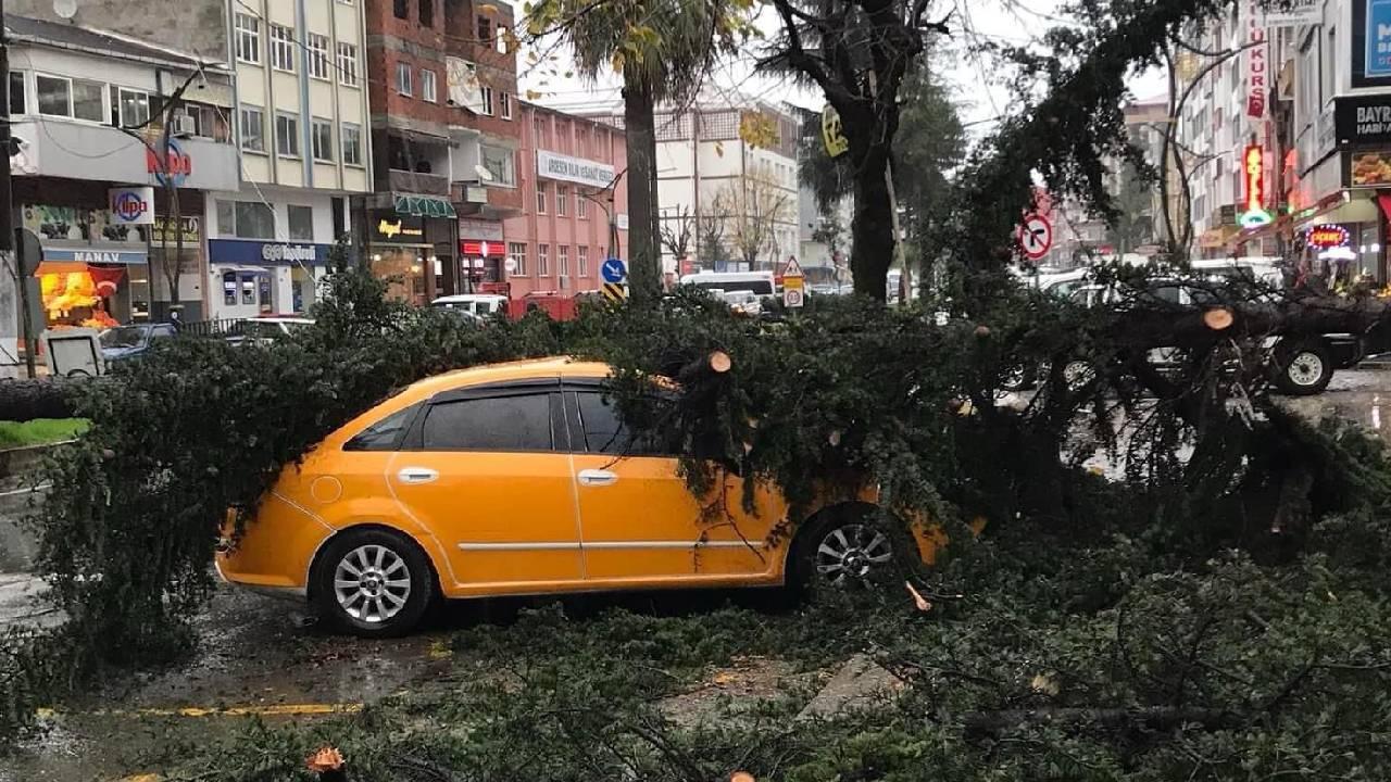 İlçede aralıklarla etkili olan fırtına, hayatı olumsuz etkiledi. Atatürk Caddesi'nde şiddetli rüzgar nedeniyle bir ağaç, park halindeki araçların üzerine devrildi.