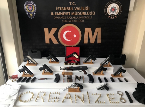 Şüphelilerin adreslerinde ele geçirilen kalaşnikof, 11 tabanca ve fişekler emniyette sergilendi.