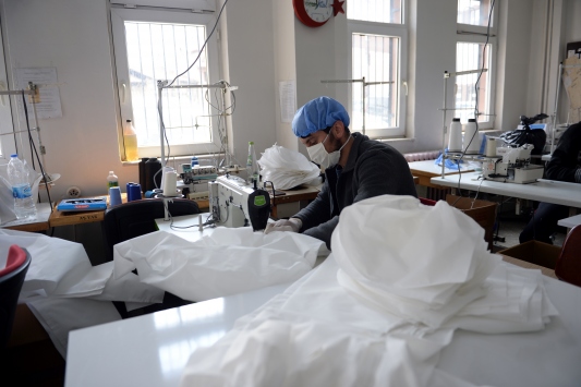 Enstitüde 13 çalışanla, 3 haftadır sağlıkçılar için üretilen tulum, maske ve önlükler, yetkililere teslim ediliyor.