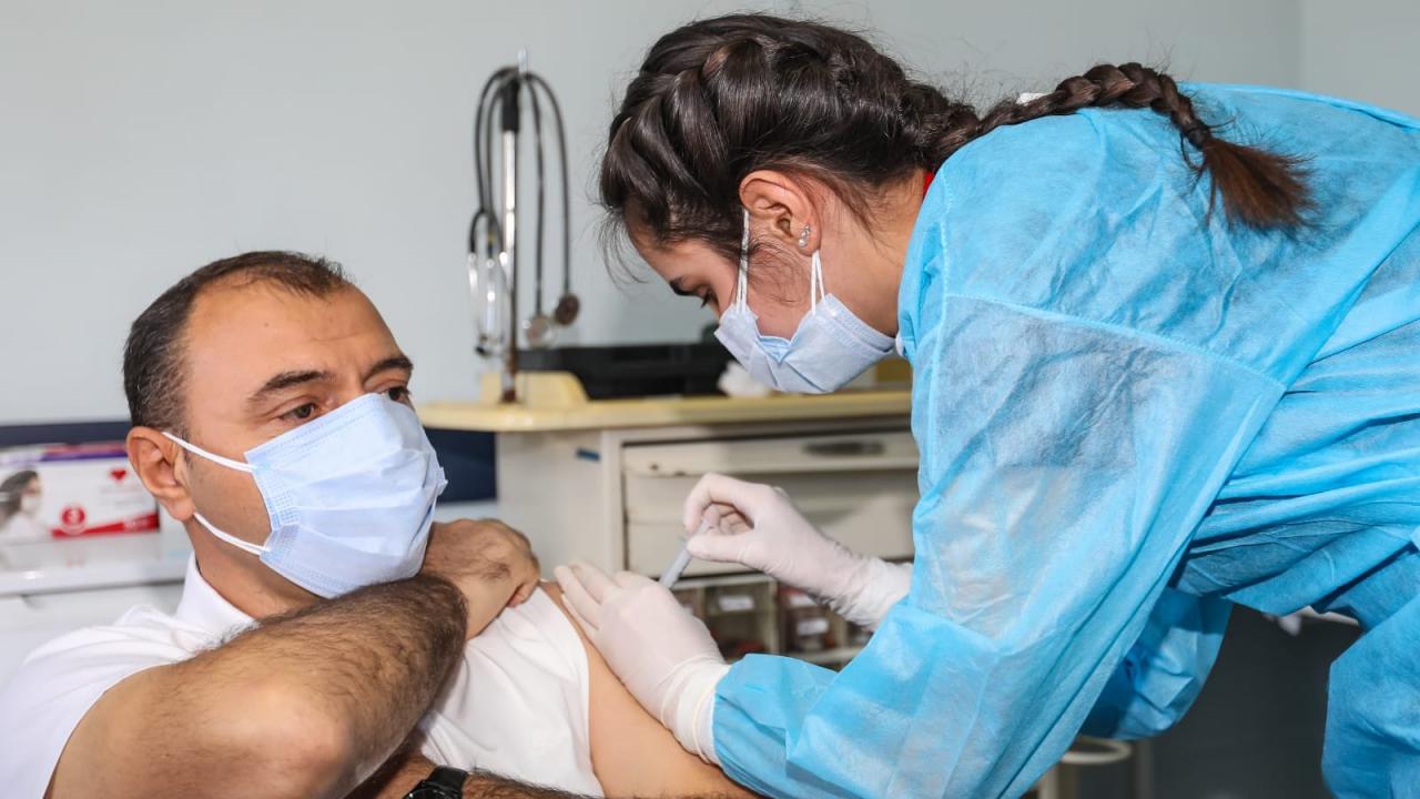 Kaldırım'a aşı olurken İl Sağlık Müdürü Aziz Öğütlü de eşlik etti.