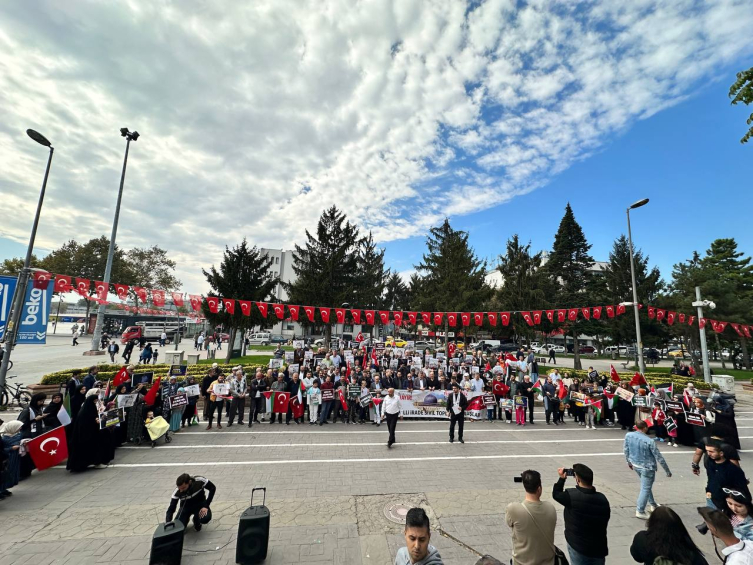 Ticaret ve Sanayi Odası önünde bir araya gelen sivil toplum kuruluşları adına açıklama yapan Memur-Sen İl Temsilcisi Zeki Öz, siyonizme karşı onurluca direnen Filistinlilere omuz vermek ve kutlu direnişi selamlamak için toplandıklarını söyledi.