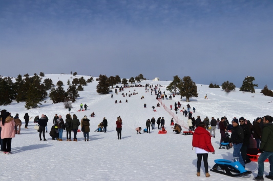 Karla kaplı ormanların arasından kayak merkezine çıkan ziyaretçiler, kayak ve snowboard yapmanın keyfini yaşıyor.