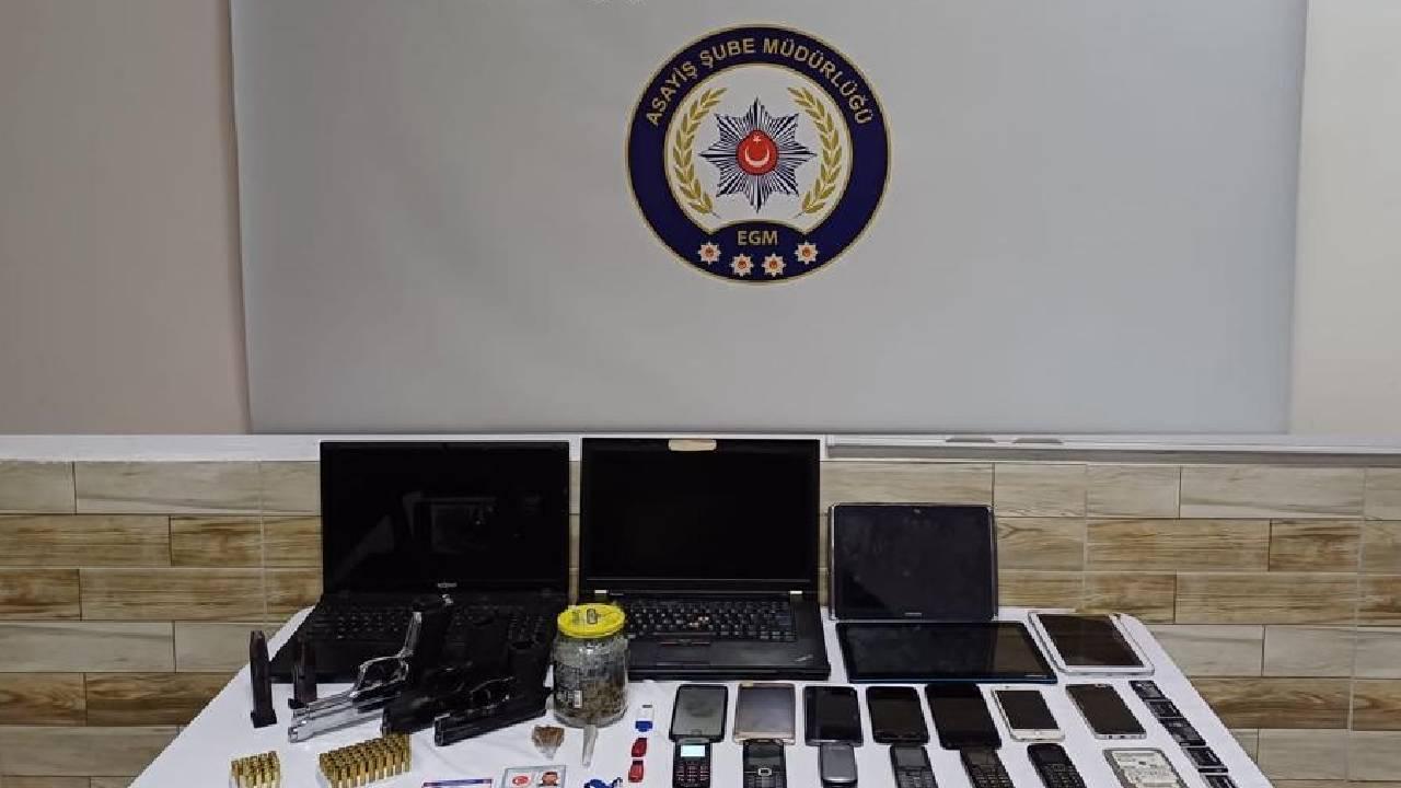 Zanlıların adreslerindeki aramada, ruhsatsız 2 tabanca ve 1 av tüfeği, 1 kurusıkı tabanca, 88 tabanca fişeği, 9,60 gram uyuşturucu, 2 sahte kimlik kartı, suçtan elde edildiği değerlendirilen 12 gram altın ve 10 bin 500 lira, 26 cep telefonu, farklı kişilere ait banka kartı ile çok sayıda dijital materyal ele geçirildi.