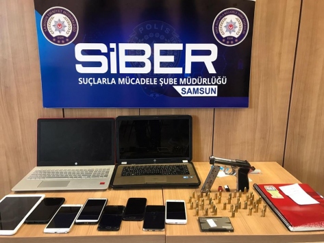 Adreslerde yapılan aramada, ruhsatsız tabanca ve 42 tabanca fişeği, 3 dizüstü bilgisayar, 7 cep telefonu, 20 banka kartı, hard disk, 2 flash bellek, 3 hafıza kartı ile not defterleri ele geçirildi.