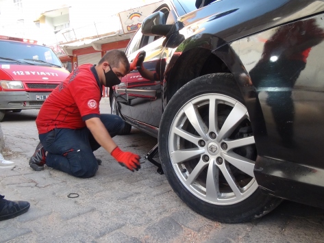 Otomobili kontrol eden ekipler, kedinin zarar görmemesi için aracın tekerini sökmeye karar verdi.