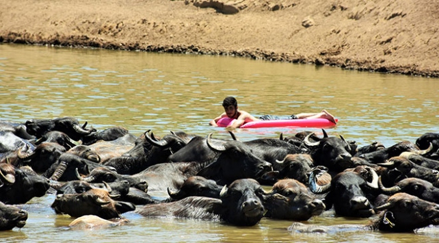 Burada yaklaşık 3 saat mandaları suda bekleten çobanlar da suda yüzerek eğlenceli vakit geçiriyor.