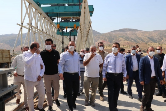 Hacıbektaşoğlu ve Ören, Siirt-Eruh kara yolu Zarova Çayı üzerinde inşası devam eden 350 metre uzunluğunda ve orta ayak yüksekliği 72 metre olan köprü ile ilgili firma yetkililerinden bilgi aldı.
