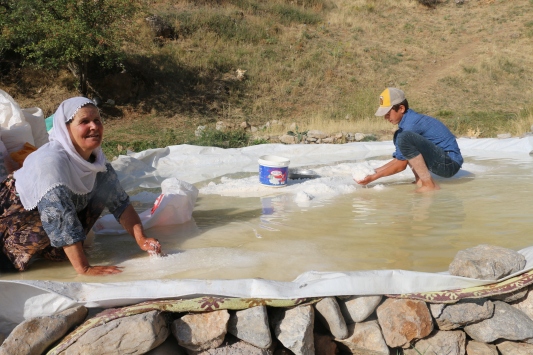 "Köyün yakın yerindeki dağlık ve vadide kuyulardan tuz elde ediyoruz. Havalar ne kadar sıcak geçerse daha temiz ve kaliteli tuz elde ediyoruz. Bu tuzu yakın köylere ve ilçelerde satıyoruz. Bir miktarını köylülere de ücretsiz veriyoruz. Tuz üretimi çok yorucu geçiyor. Yağmur yağdığında veya sel olduğunda tüm tuzu dökmek sorunda kalıyoruz. Çuvalı 20 ile 30 lira arasında satıyoruz. Çok eziyet çekiyoruz ama gelir kapısı olduğu için de mutluyuz. Benim gibi birçok aile çocuklarıyla üretim yapıyor."