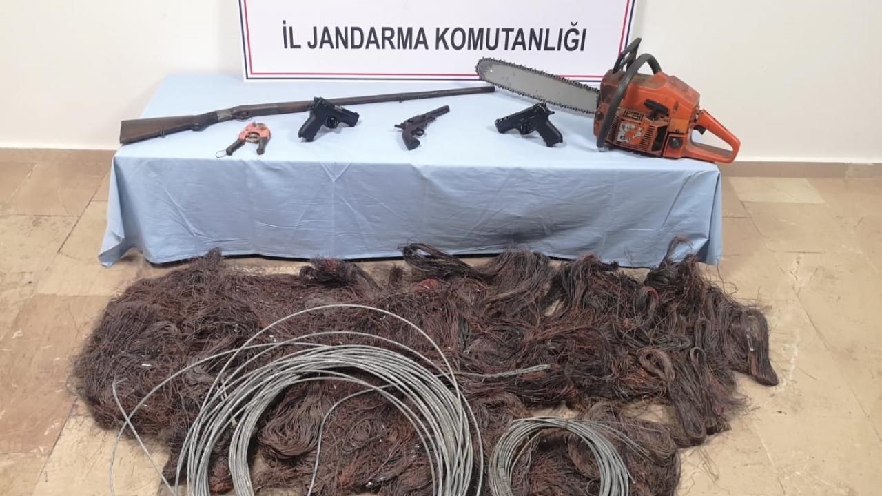 Zanlılara ait evde yapılan aramalarda 130 kilogram eritilmiş kablo, 30 metre kablodan çıkan çelik halat, 4 adet telefon direği, bir ruhsatsız av tüfeği, 3 adet tabanca ile direkleri kesmek için kullanıldığı değerlendirilen motorlu testere ele geçirildi.