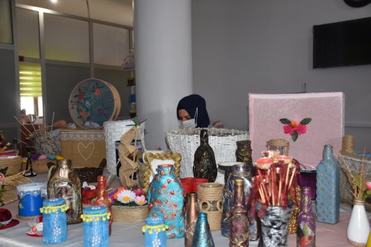 "Kadınlarımız, cam, gazete, teneke, plastik ve cam şişeleri, süsleyerek ev ve süs eşyası haline getirdi. Elimizde yaklaşık 2 binin üzerinde üretimi yapılmış ürün var. Bunun yanı sıra atık kumaştan kadınlarımız yıkanabilir 100 binin üzerinde maske üretti. Bu maskeleri ücretsiz olarak özellikle 65 yaş üstü büyüklerimize dağıttık."