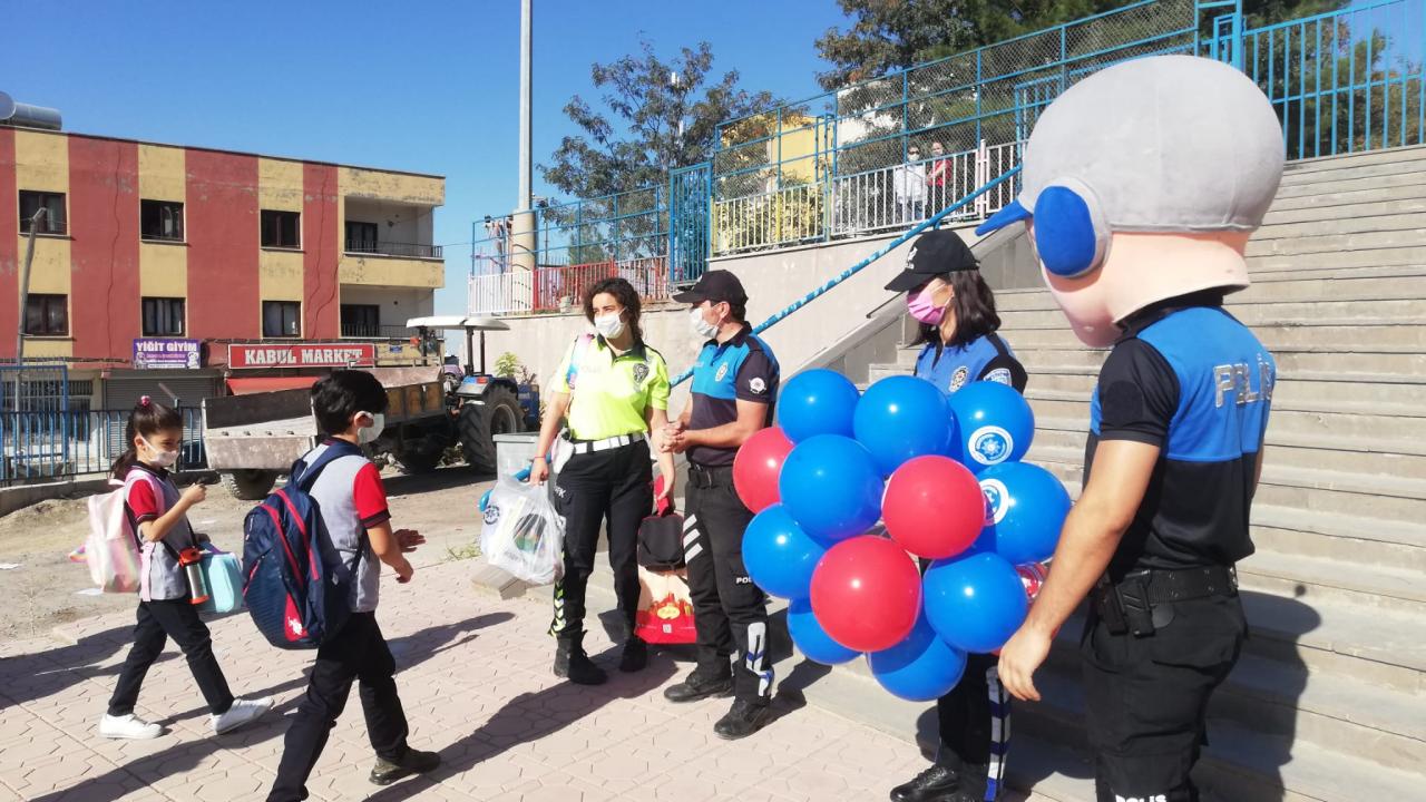 Okul girişinde polis maskotuyla karşılanan öğrencilere salgın tedbirleri hatırlatıldı, maske ve çeşitli hediyeler verildi.