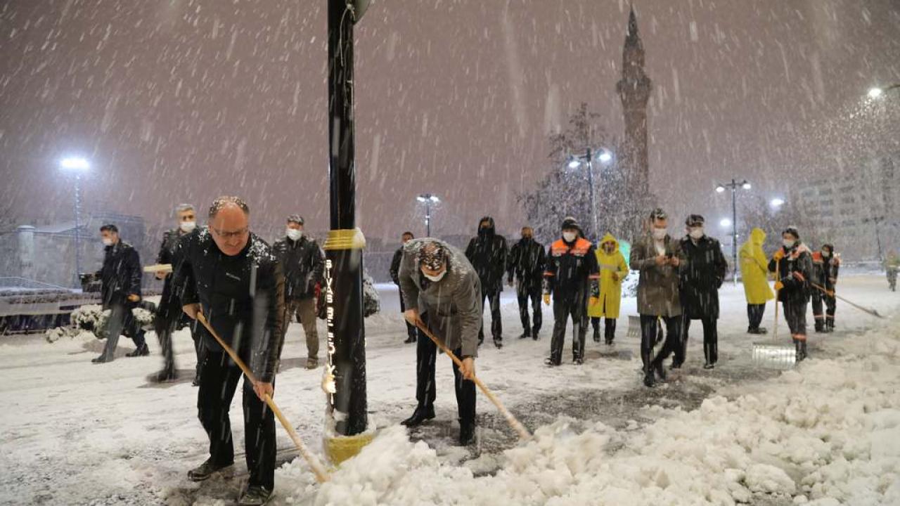 Valilikten yapılan açıklamaya göre, sevinçle karşılanan Sivas'ta kar yağışı ile Vali Salih Ayhan, AK Parti Sivas Milletvekili Habib Soluk, Belediye Başkanı Hilmi Bilgin, şehir meydanına gelerek burada yapılan çalışmaları inceledi.
