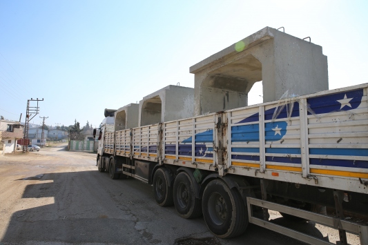 Sınırda konuşlu birliklere ulaştırılmak üzere gönderilen beton mevzilerin bulunduğu 15 tır, Hatay'ın Reyhanlı ilçesine ulaştı.