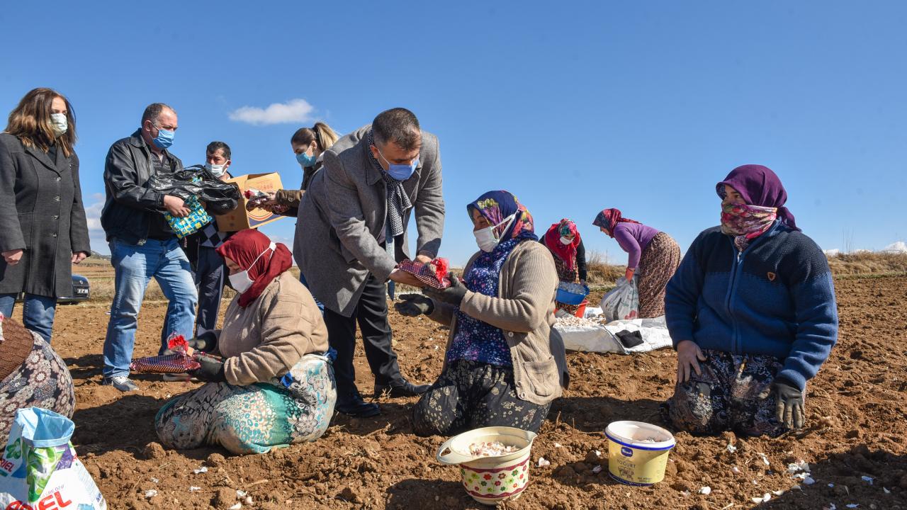 Belediye Başkanı Çatal, Taşköprü sarımsağının dikimini yapan kadınları tarlada ziyaret ederek, karanfil ve çeşitli hediyeler takdim etti. Çatal, ayrıca kadınlarla birlikte pasta kesti.