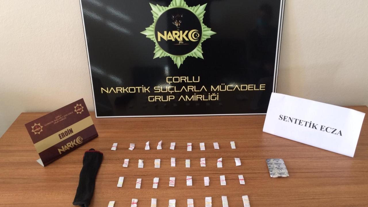 Şüphelinin üst aramasında 10 uyuşturucu hap ve 20 gram eroin ele geçirildi.