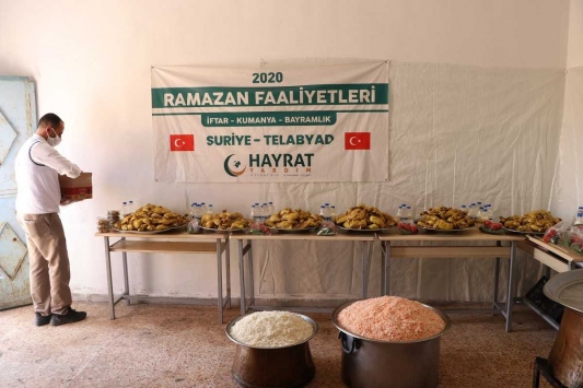 Şanlıurfa Valiliği bünyesindeki Suriye Destek ve Koordinasyon Merkezi (SUDKOM) ile organize çalışan Türkiye'deki birçok sivil toplum kuruluşu, hayırseverlerin bağışlarıyla Tel Abyad ve Rasulayn'da ihtiyaç sahiplerinin sofralarını şenlendiriyor.