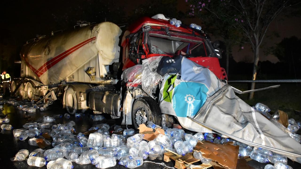 İzmir'in Bornova ilçesinde, seyir halindeki bir tır, kayganlaşan zeminde sürücüsünün direksiyon hakimiyetini kaybetmesi sonucu, park halindeki beton mikserine çarptı. Kazada, tır'ın dorsesinde bulunan litrelik su şişeleri yola savrulurken, iki araçta da hasar meydana geldi.