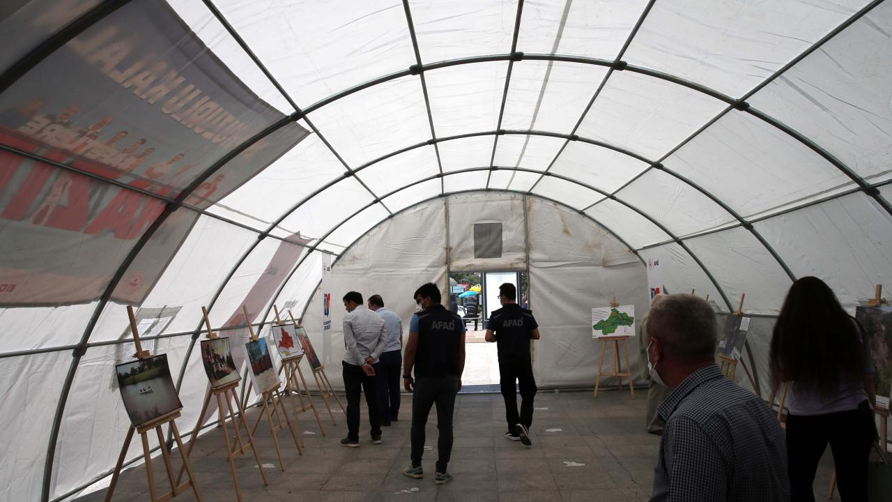 Cumhuriyet Meydanı'nda açılan çadırda AFAD ekiplerinin müdahale ettikleri olaylarda çektikleri fotoğraflar sergilenirken, çadır girişinde vatandaşlara AFAd ile ilgili broşürler dağıtıldı.