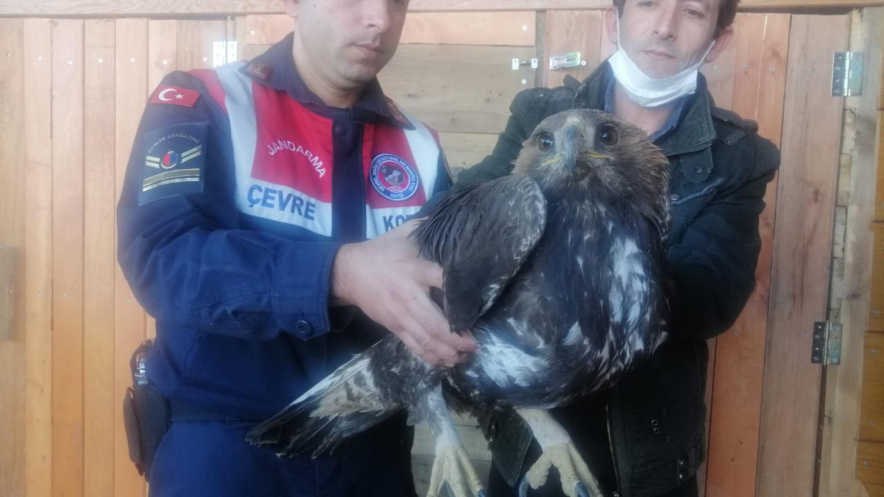Güzelbeyli köyü kırsalında devriye gezen Jandarma Çevre Doğa ve Hayvanları Koruma Timi tarafından yerdeki kartalının hareket edemediği fark edildi.